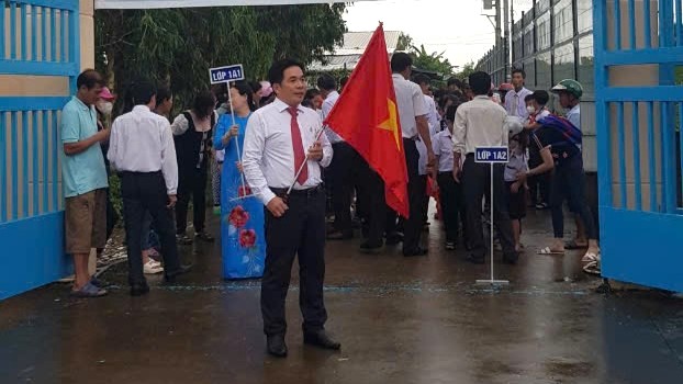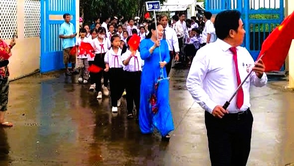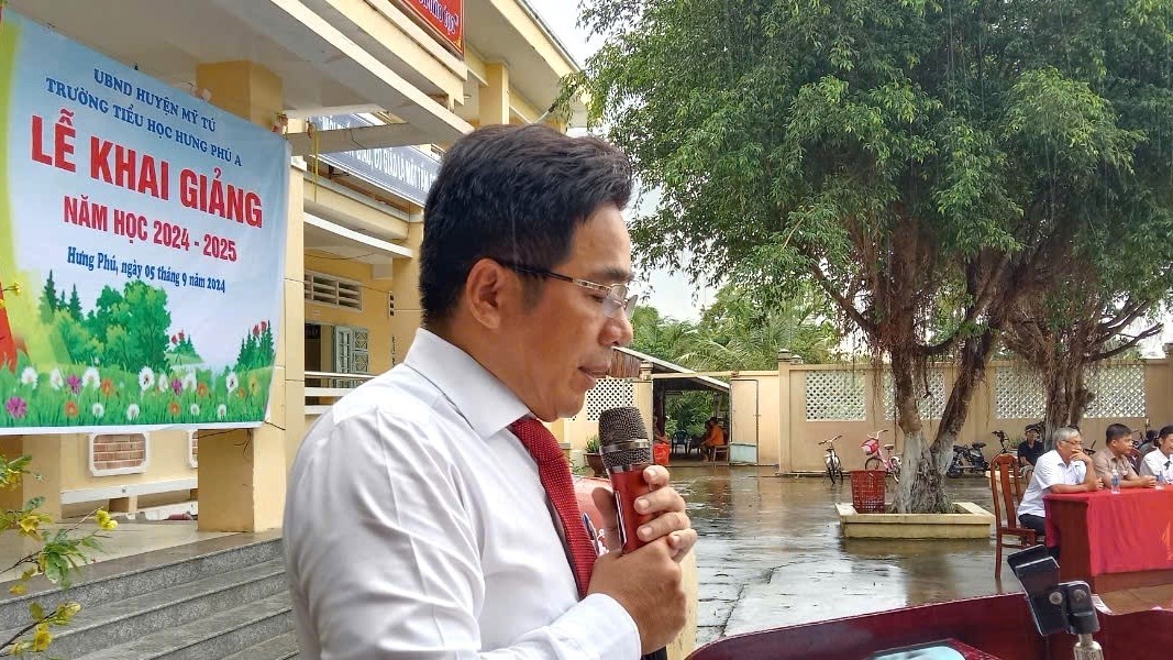 Ảnh Ông Trương Phước Sang, Chủ tịch UBND xã Hưng Phú đánh trống khai giảng năm học 2024-2025.