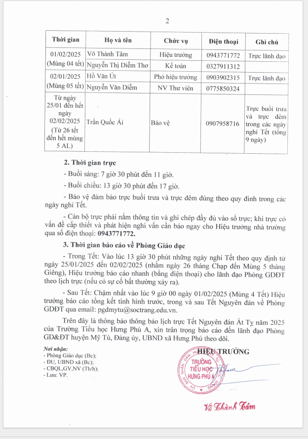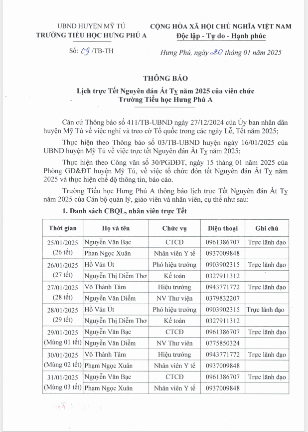 Lịch trực Tết Ất Tỵ năm 2025 của viên chức Trường Tiểu học Hưng Phú A